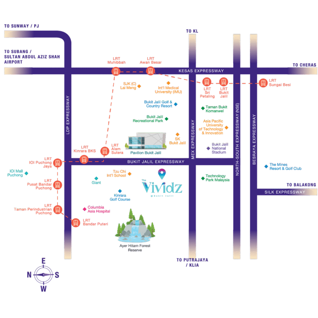 The Vividz @ Bukit Jalil enjoys a prime location between Kuala Lumpur and Petaling Jaya, offering excellent accessibility for work and lifestyle. It is just 5 minutes from Pavilion Bukit Jalil, with KL Wellness Centre and modern retail right at your doorstep. Well-connected via major highways such as the Maju Expressway (MEX) and Damansara-Puchong Expressway (LDP), Vividz delivers everyday convenience and seamless connectivity for modern urban living.